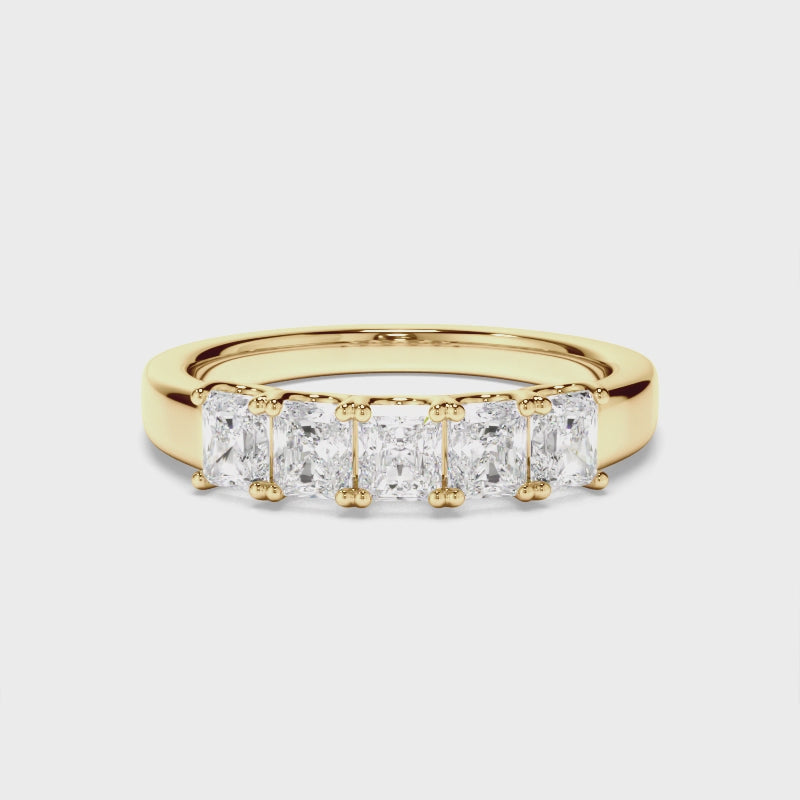This stunning custom-made anniversary ring features five radiant cut diamonds set on an 18ct gold or platinum band. Exuding fluidity in its line work, and boasting an elegant silhouette, as with all the pieces in our Bespoke Collection, this piece is made especially for you.